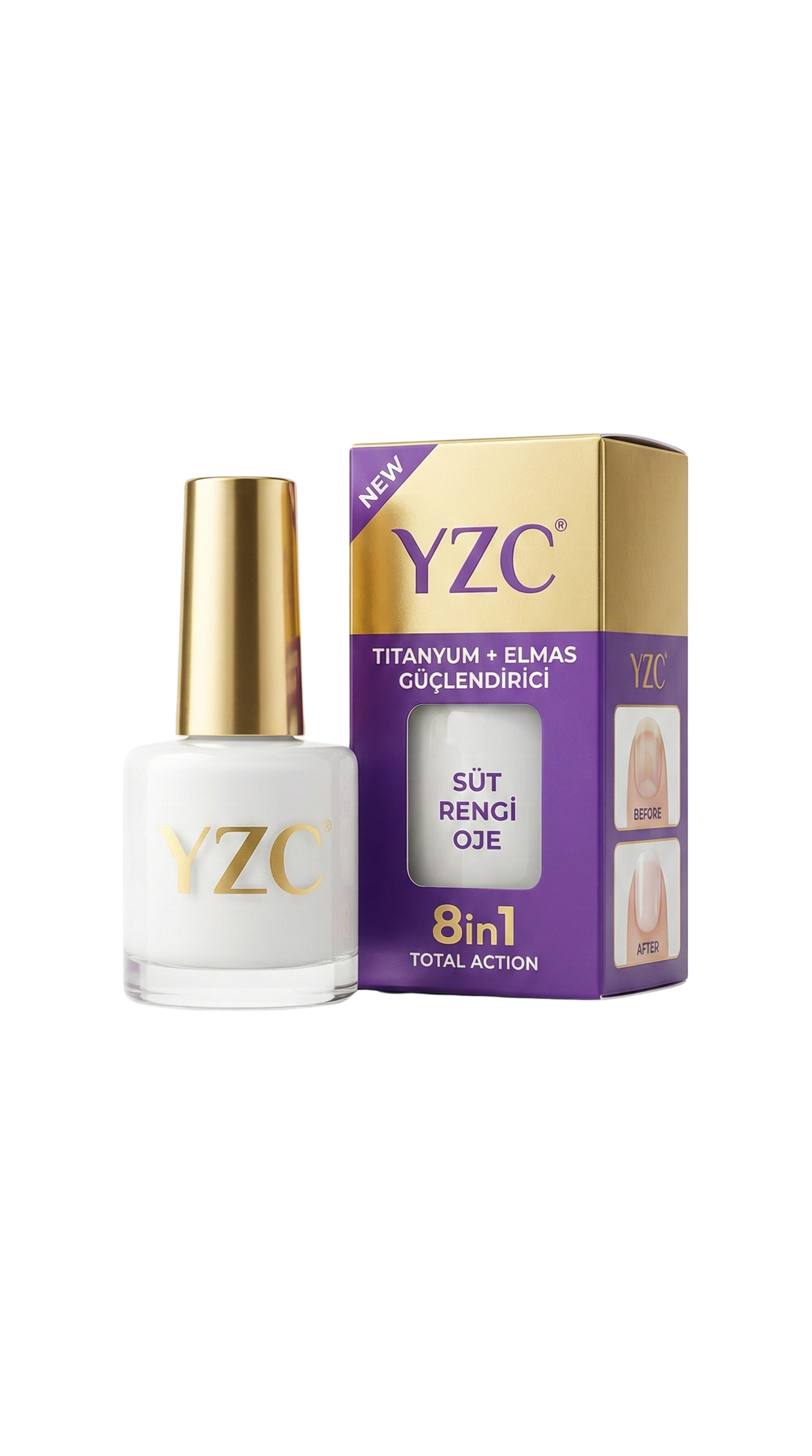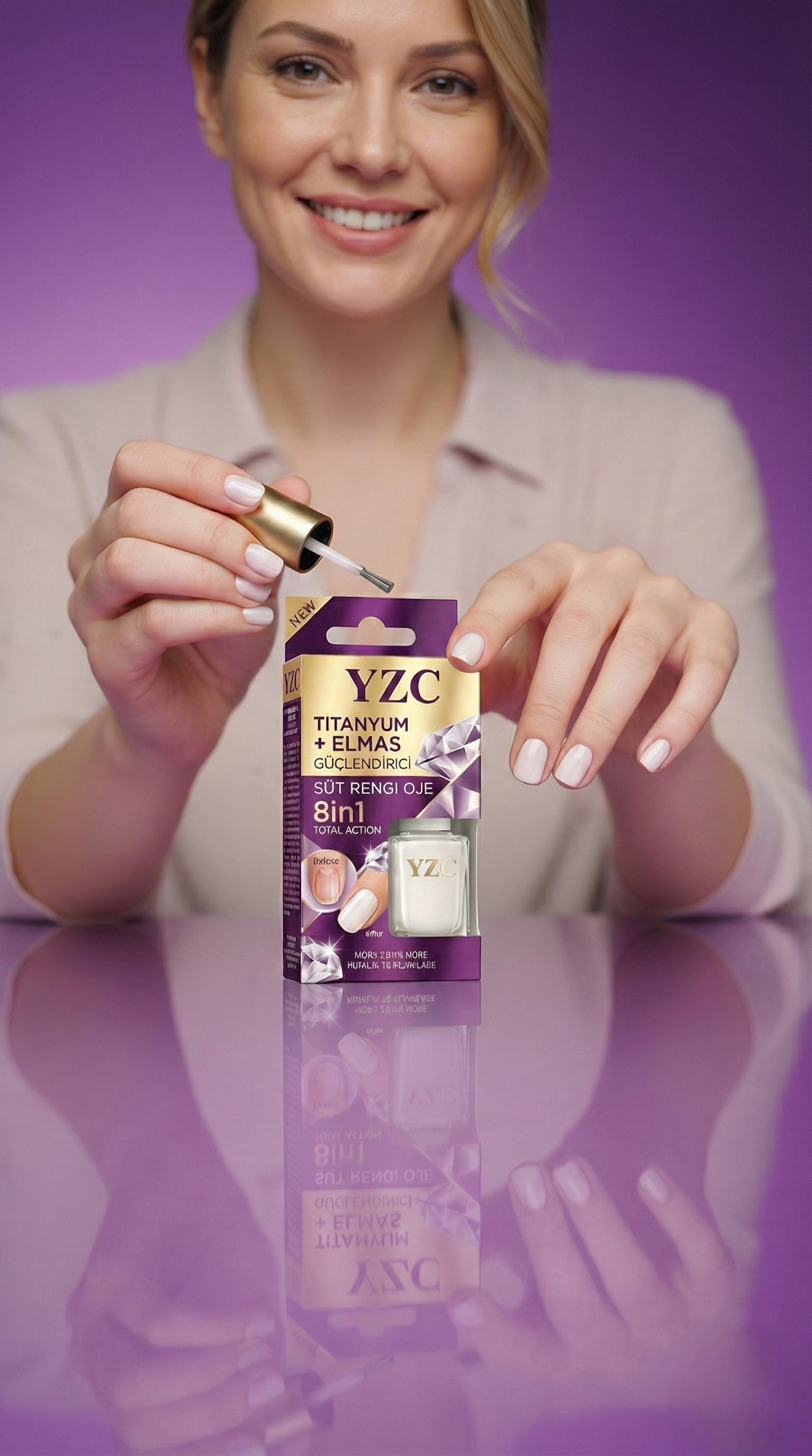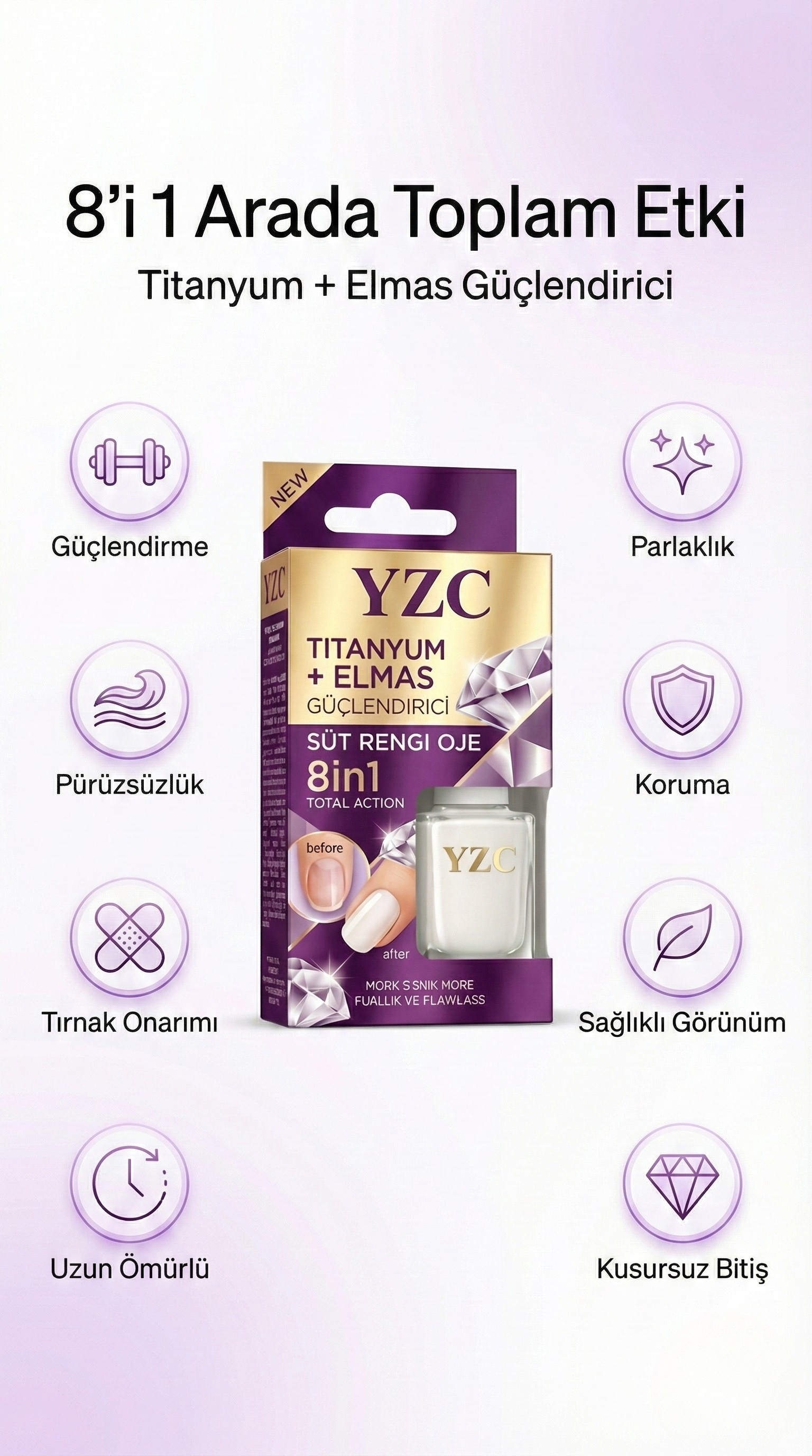 "8in1 etkisi gerçekten işe yarıyor! Tırnaklarım hem güçlendi hem de çok parlak görünüyor. Süt rengi tonu da çok şık, her gün kullanıyorum."